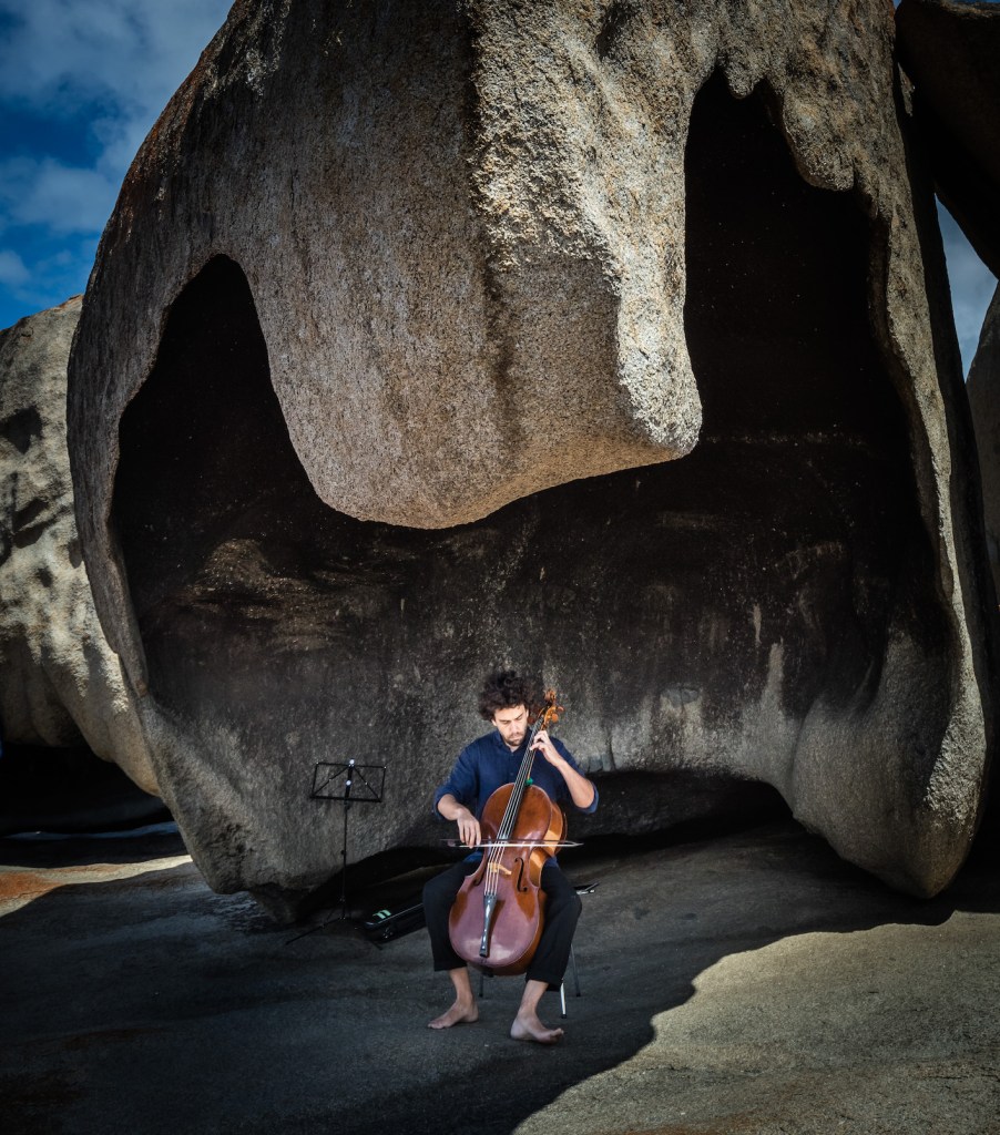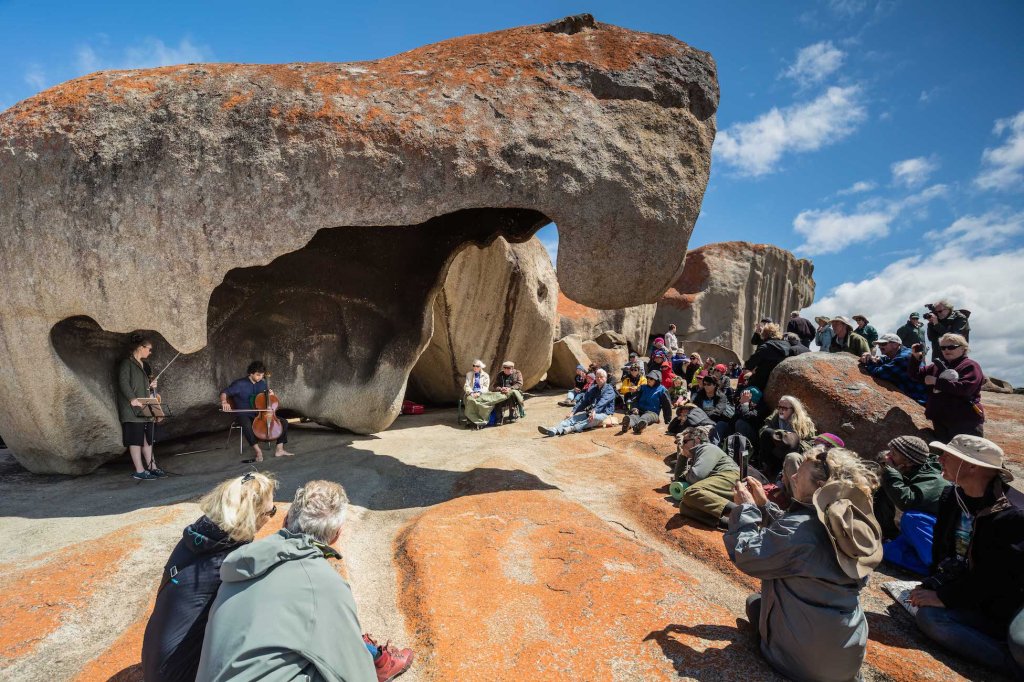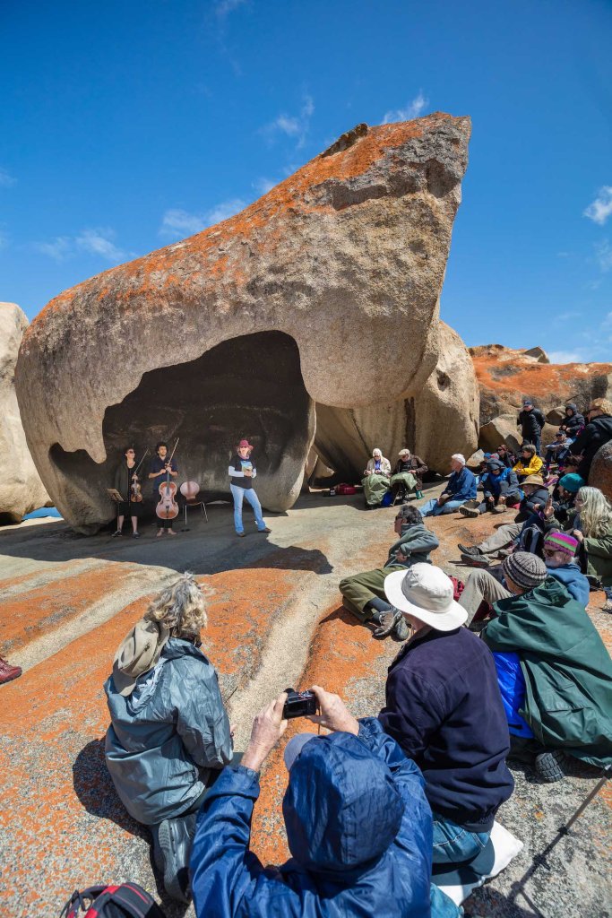 Anthony Albrecht and Simone Slattery (Where Song Began) performed a repertoire of music to connect us with the landscape, on a stage half a billion years old, using instruments made 300 years ago, long before Europeans discovered the island. Anthony began by playing Australian composer Sarah Hopkins’ ‘Reclaiming the Spirit’, evoking whales calling, indigenous song and jumping kangaroos. Simone led the audience is singing ‘Ngarra Burra Ferra’, a traditional Yorta Yorta song – perhaps the first time in thousands of years that an indigenous song has been sung in that place.